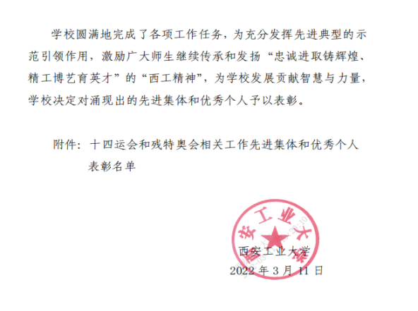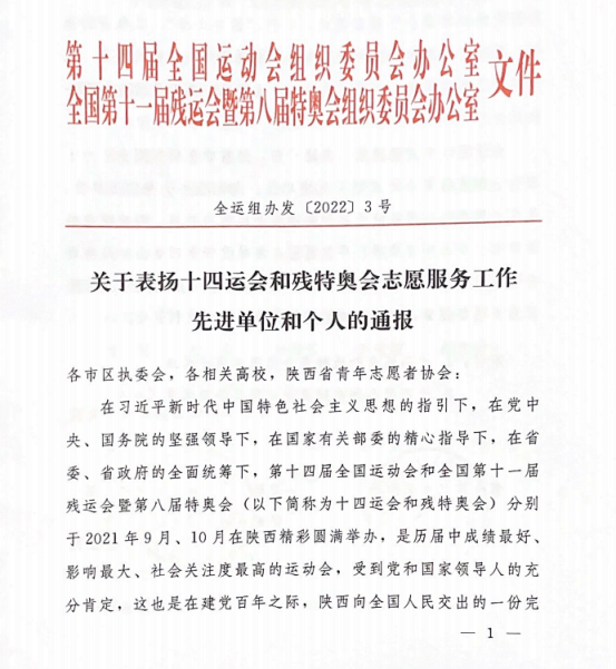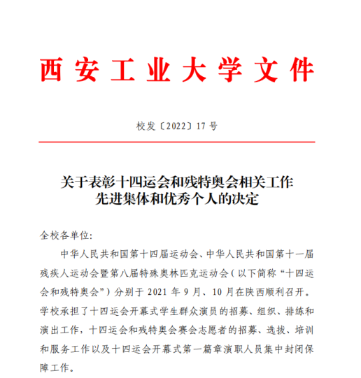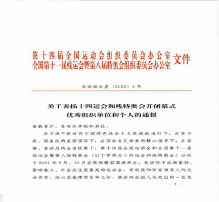 近日,第十四届全国运动会组织委员会办公室、全国第十一届残运会暨第八届特奥会组织委员会办公室联合印发了《关于表扬十四运会和残特奥会志愿服务工作先进单位和个人的通报》和《关于表扬十四运会和残特奥会开闭幕式优秀组织单位和个人的通报》,我校荣获“十四运会和残特奥会志愿服务先进单位”和“十四运会开闭幕式优秀组织单位”荣誉称号,多名师生荣获表彰。GG扑克注册