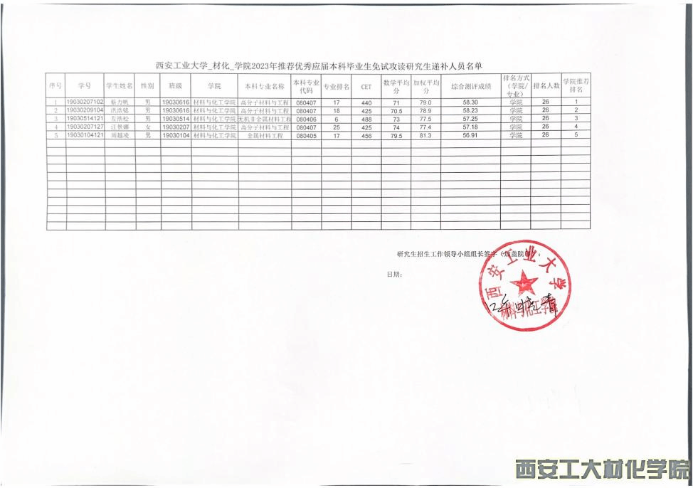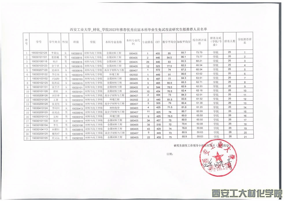 按照《西安工业大学推荐(接收)优秀应届本科毕业生免试攻读研究生实施办法(修订)》及《2023年GG扑克官网 推荐西安工业大学应届本科毕业生免试攻读硕士学位实施细则》,现将GG扑克官网 2023年推荐优秀应届本科毕业生免试攻读研究生拟推荐人员名单和递补名单予以公示,公示期为2022年9月17日-23日。如有异议,请于2022年9月23日18时前实名向学院联系人反馈,联系人:胡娜 联系电话:029-86173324。